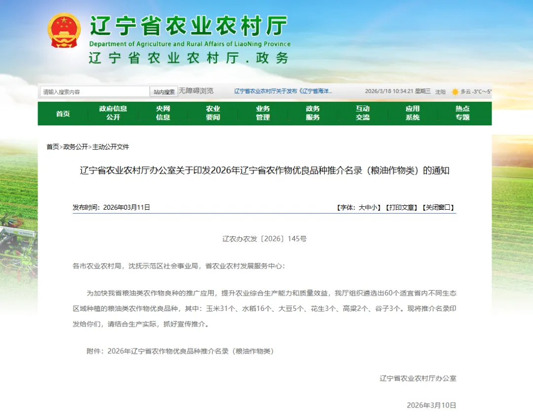 近日,遼寧省農業農村廳發布了2026年遼寧省農作物優良品種推介名錄,遼寧東亞種業自主培育的東單1331、東科1188、豐平108入選2026年遼寧省農業主導品種。